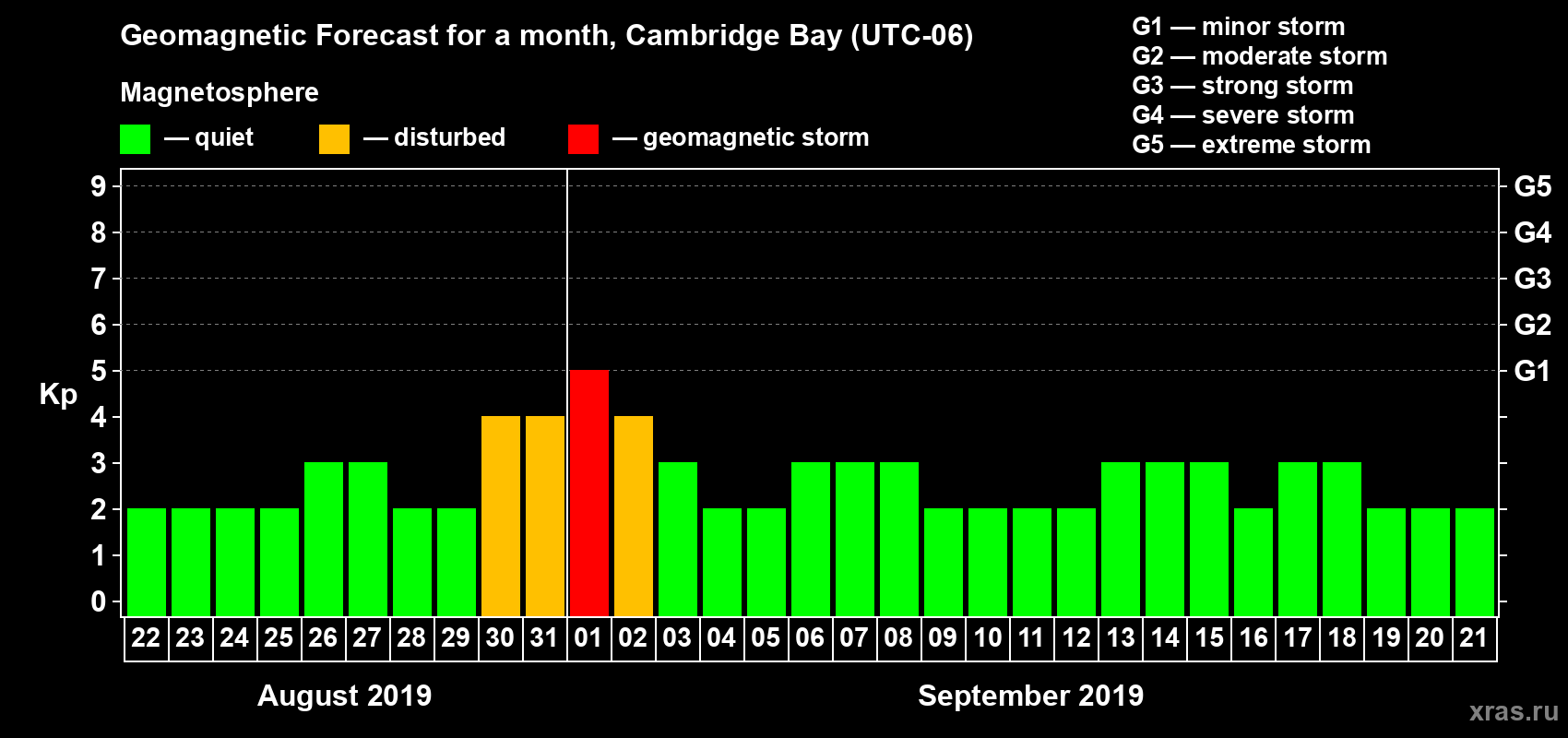 Geomagnetic storm forecast in Cambridge Bay for Aug 22, 2019