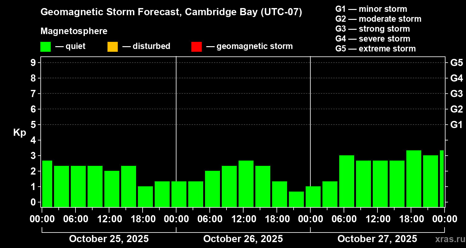 Geomagnetic storm forecast in Cambridge Bay for Oct 25, 2025