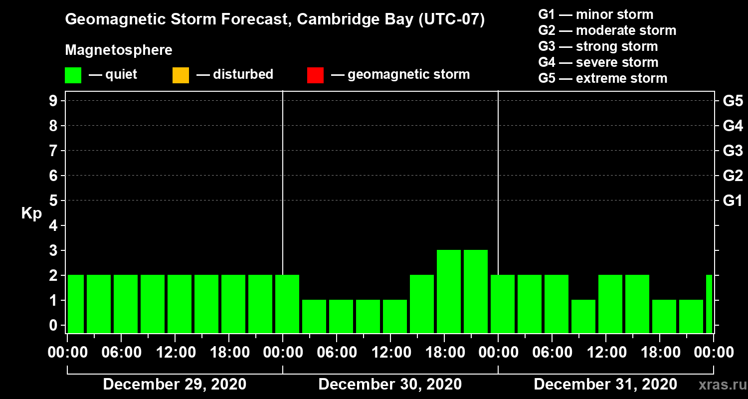 Geomagnetic storm forecast in Cambridge Bay for Dec 29, 2020