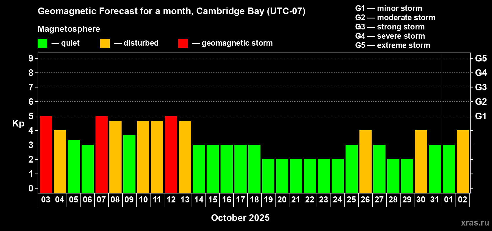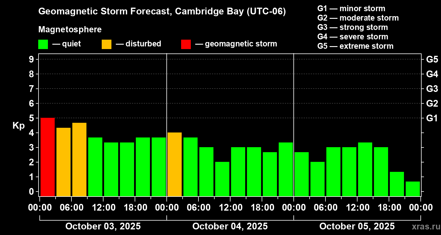 Geomagnetic storm forecast in Cambridge Bay for Oct 03, 2025