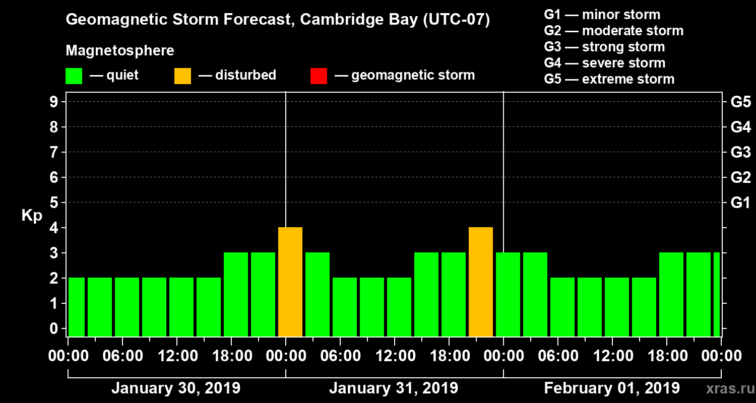 Geomagnetic storm forecast in Cambridge Bay for Jan 30, 2019