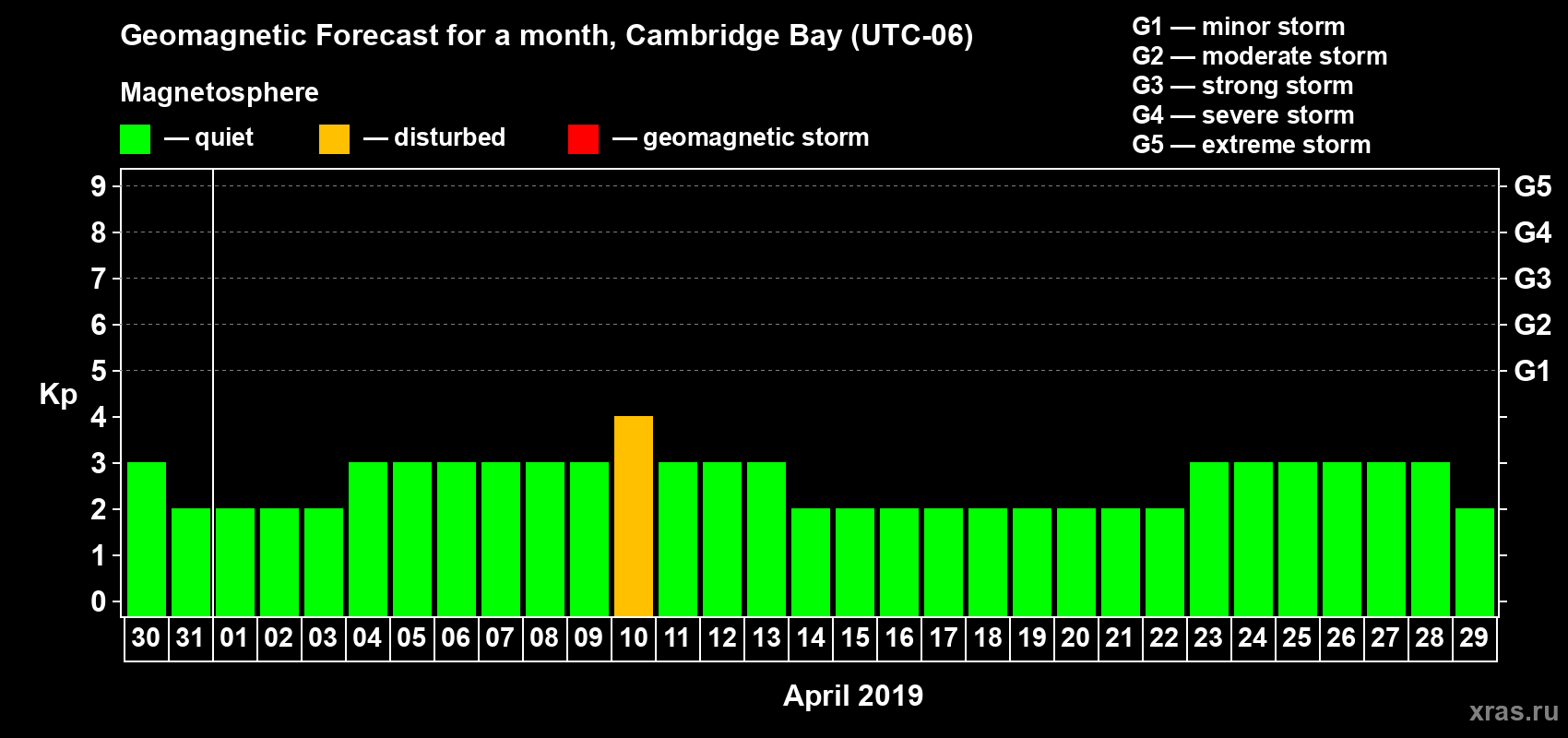 Geomagnetic storm forecast in Cambridge Bay for Mar 30, 2019