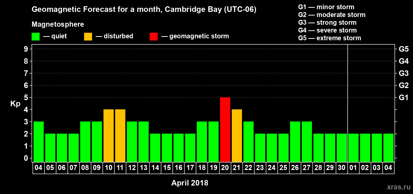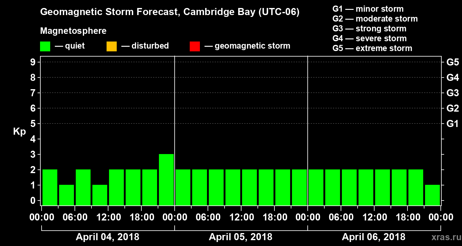 Geomagnetic storm forecast in Cambridge Bay for Apr 04, 2018