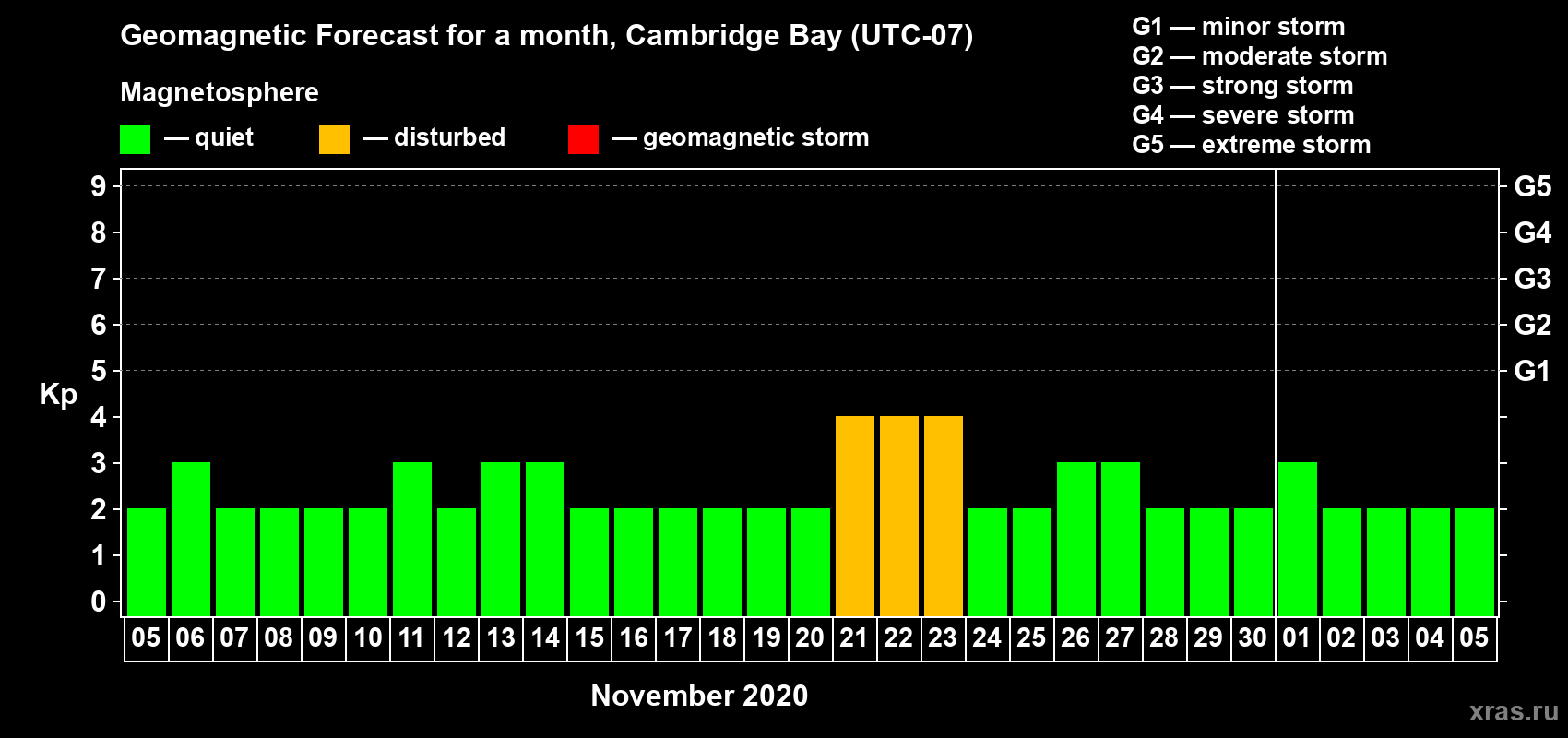 Geomagnetic storm forecast in Cambridge Bay for Nov 05, 2020