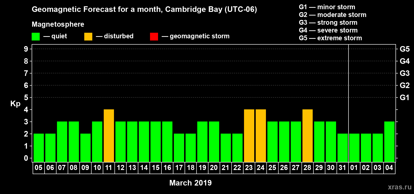 Geomagnetic storm forecast in Cambridge Bay for Mar 05, 2019