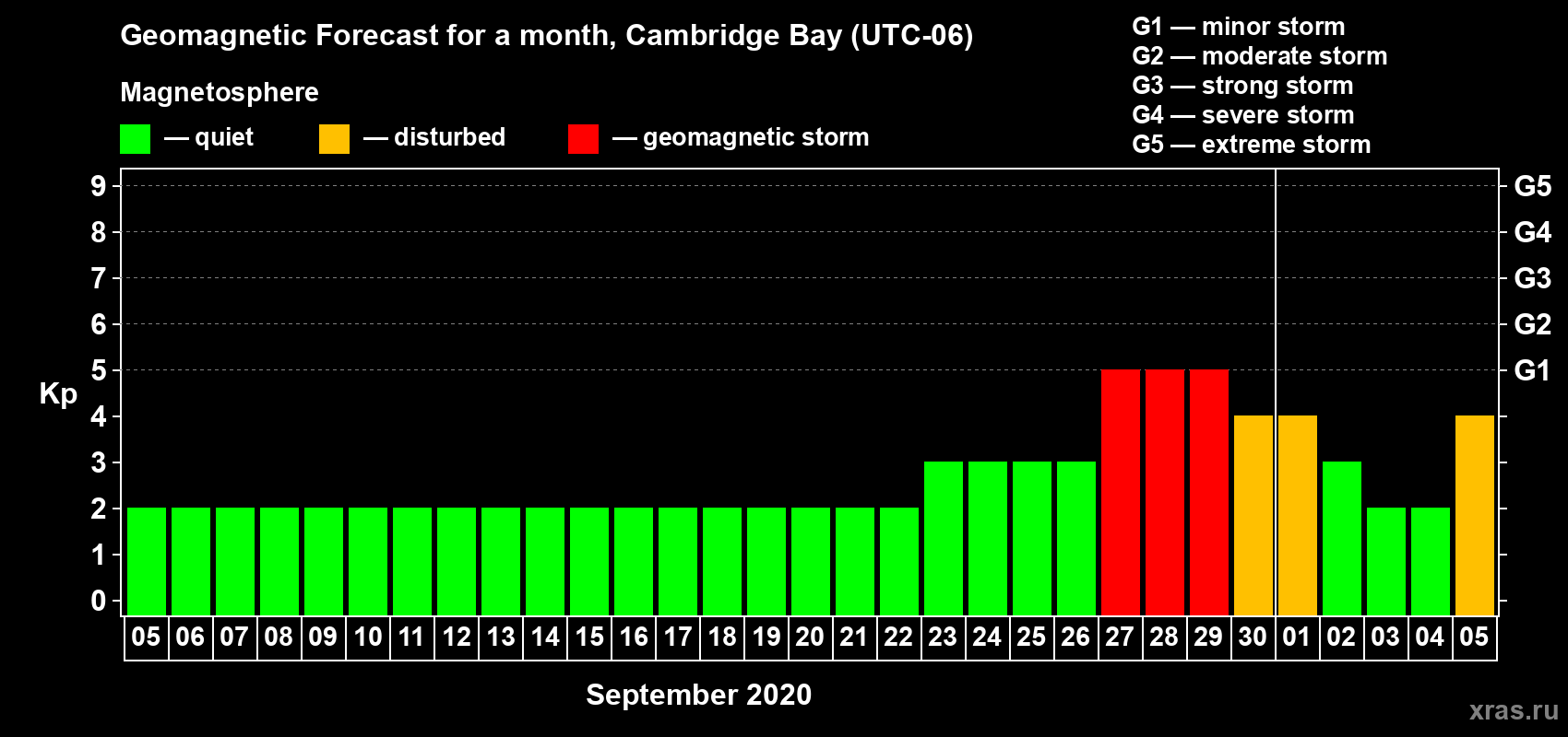 Geomagnetic storm forecast in Cambridge Bay for Sep 05, 2020