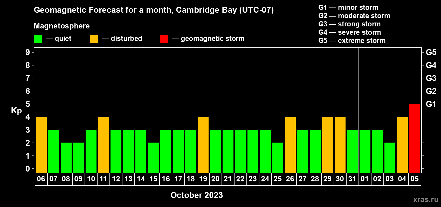 Geomagnetic storm forecast in Cambridge Bay for Oct 06, 2023