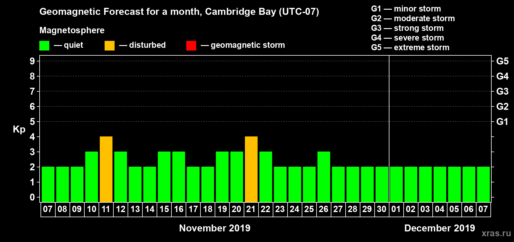 Geomagnetic storm forecast in Cambridge Bay for Nov 07, 2019