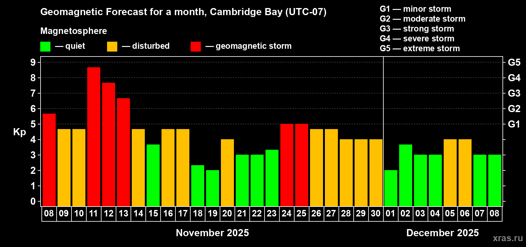 Geomagnetic storm forecast in Cambridge Bay for Nov 08, 2025