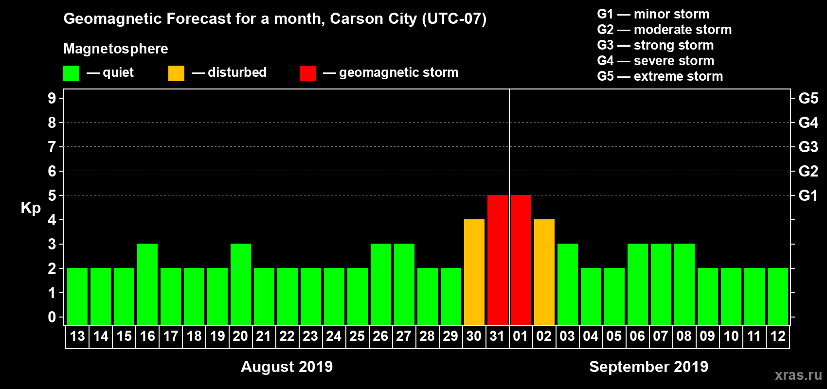 Geomagnetic storm forecast in Carson City for Aug 13, 2019