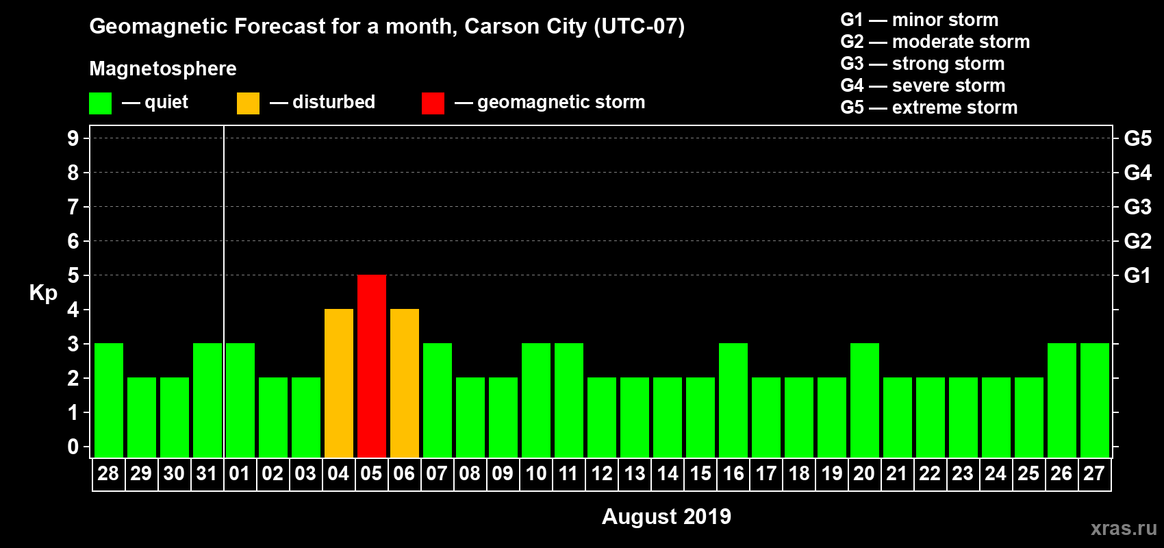 Geomagnetic storm forecast in Carson City for Jul 28, 2019
