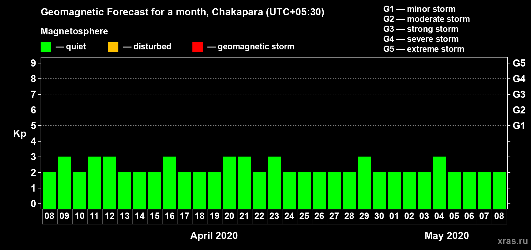 Geomagnetic storm forecast in Chakapara for Apr 08, 2020