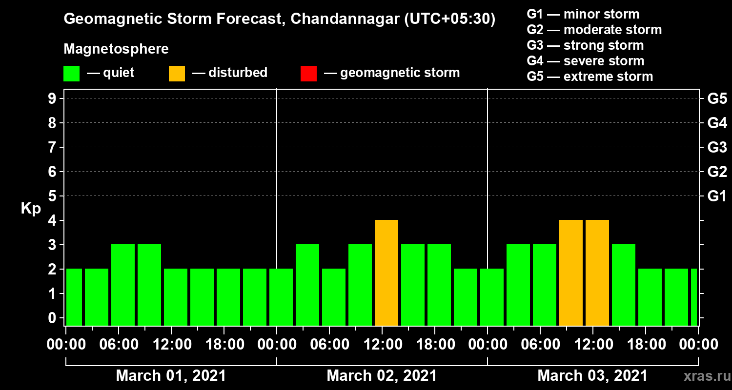 Geomagnetic storm forecast in Chandannagar for Mar 01, 2021