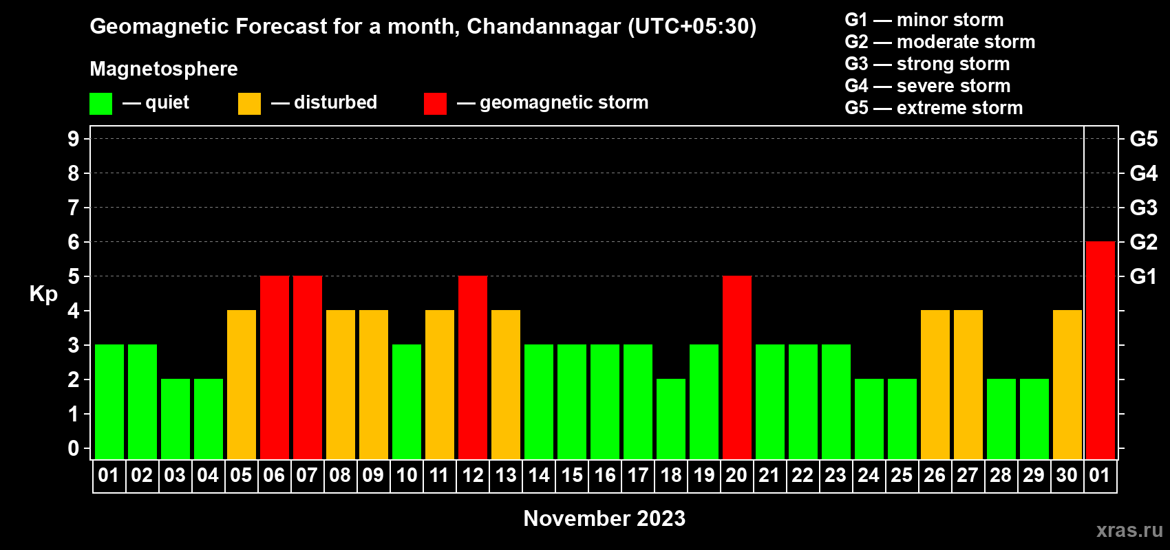 Geomagnetic storm forecast in Chandannagar for Nov 01, 2023