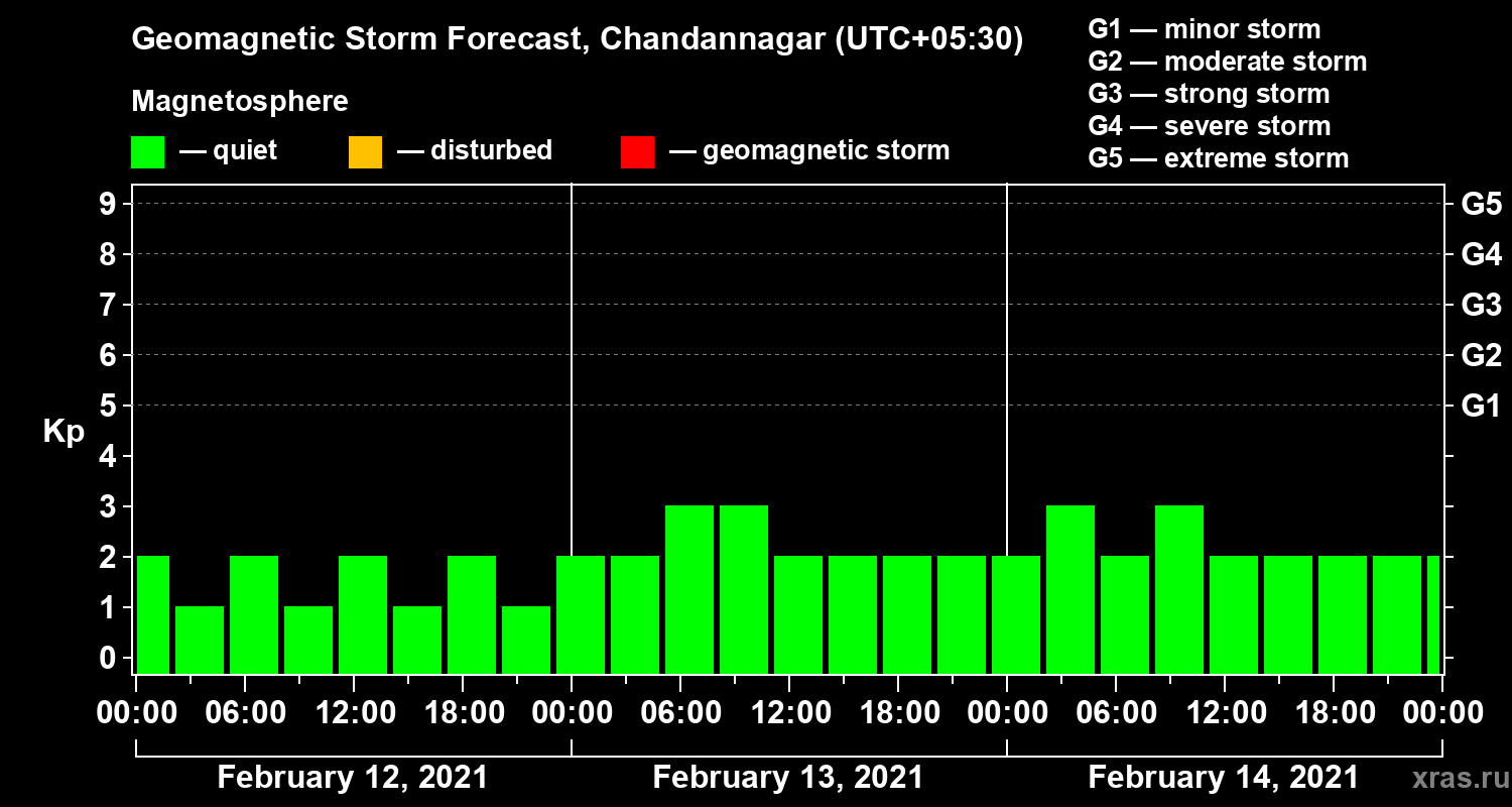 Geomagnetic storm forecast in Chandannagar for Feb 12, 2021