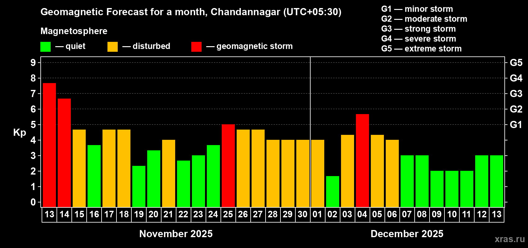 Geomagnetic storm forecast in Chandannagar for Nov 13, 2025