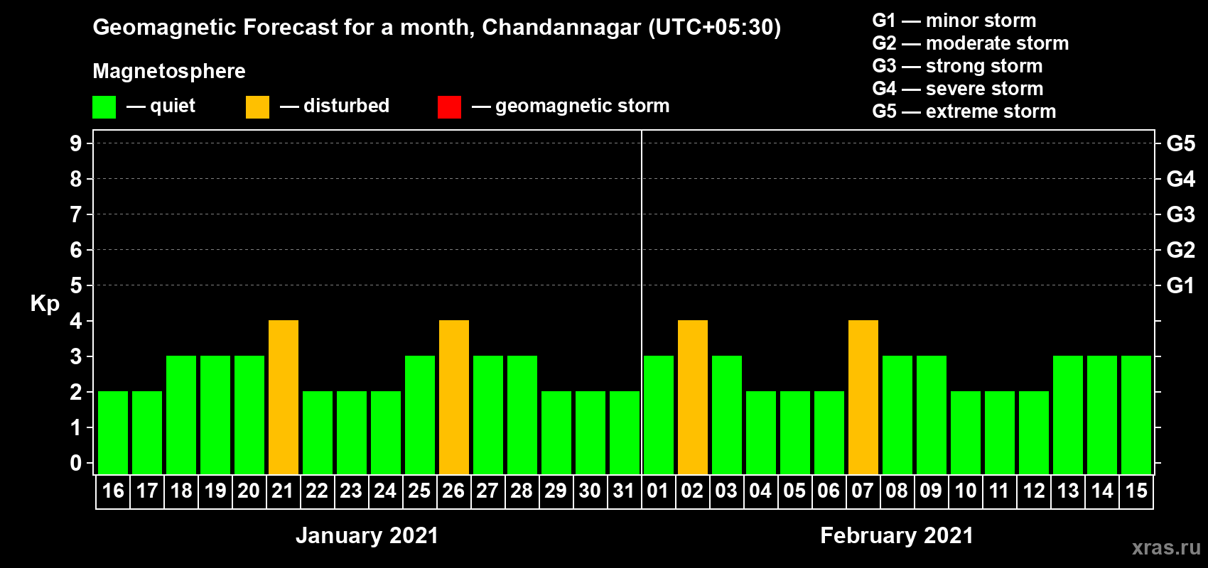 Geomagnetic storm forecast in Chandannagar for Jan 16, 2021