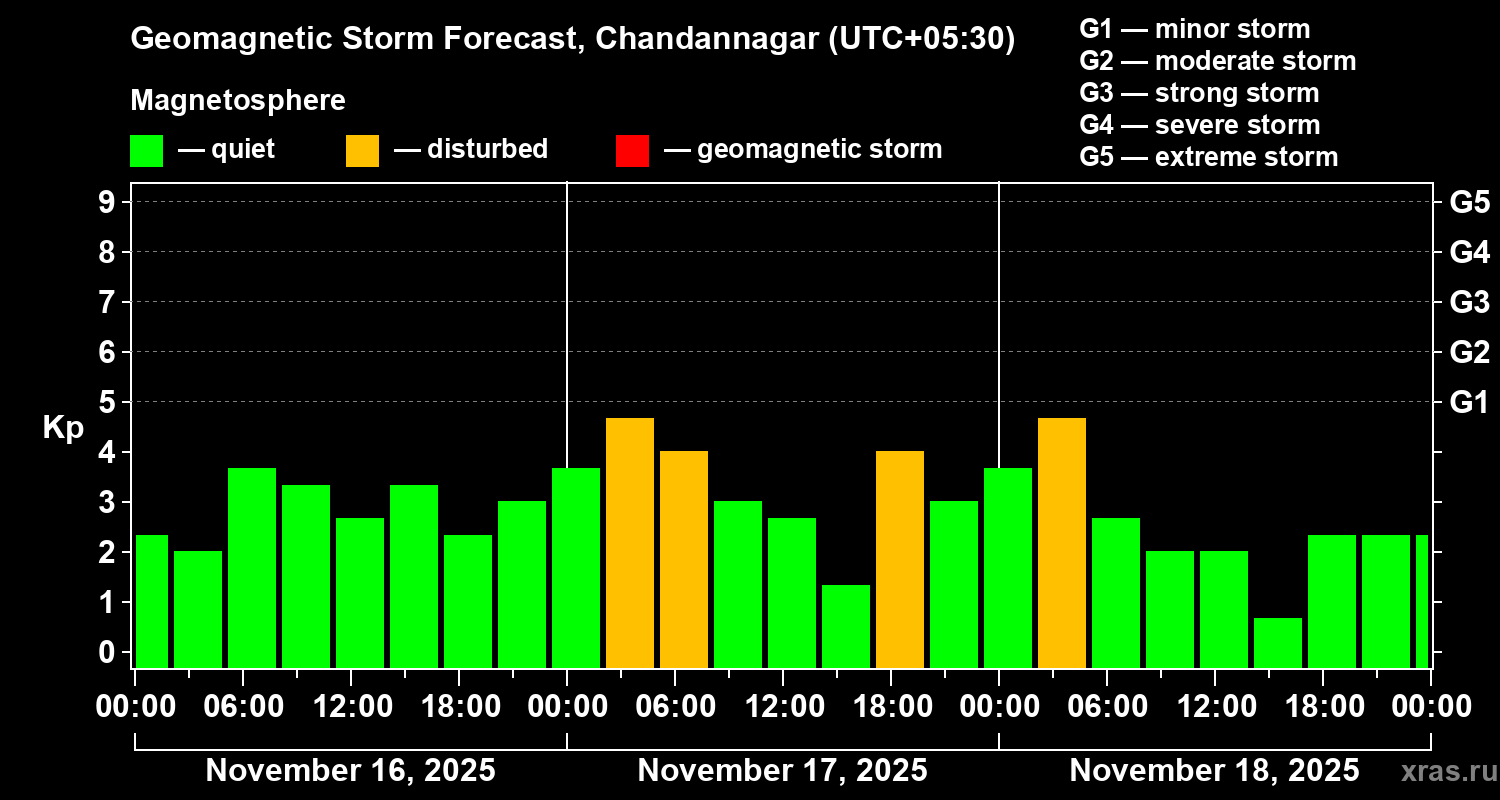 Geomagnetic storm forecast in Chandannagar for Nov 16, 2025