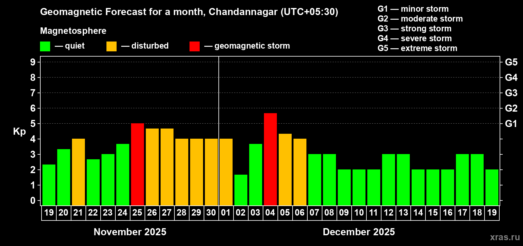 Geomagnetic storm forecast in Chandannagar for Nov 19, 2025