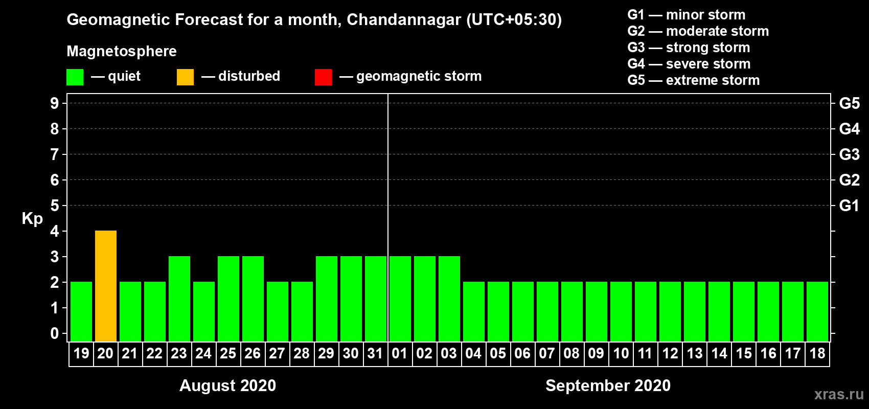 Geomagnetic storm forecast in Chandannagar for Aug 19, 2020