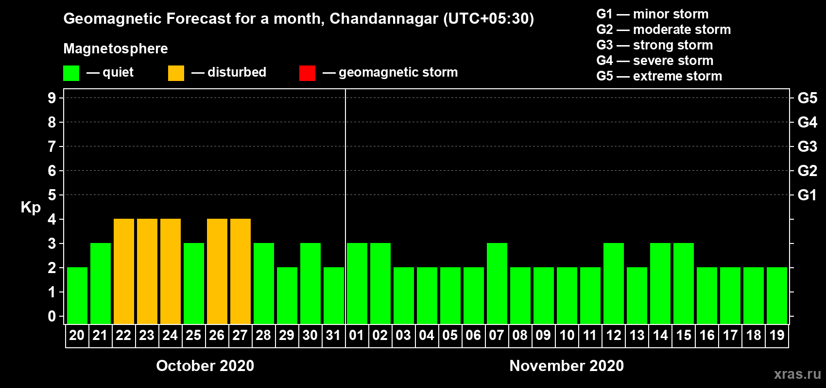 Geomagnetic storm forecast in Chandannagar for Oct 20, 2020