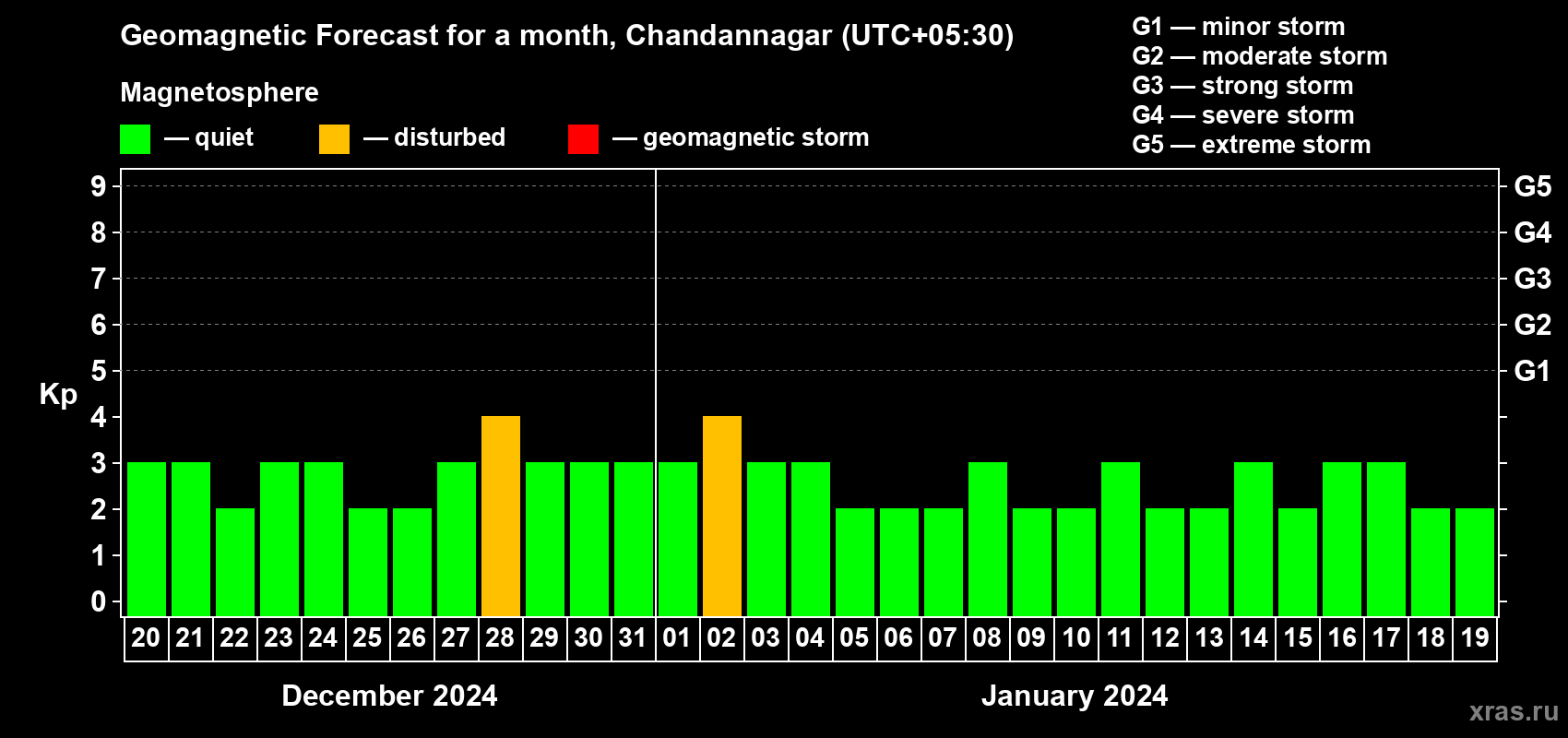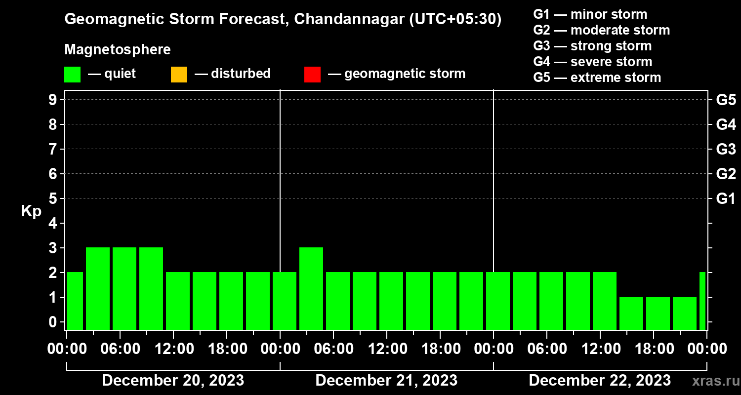 Geomagnetic storm forecast in Chandannagar for Dec 20, 2023