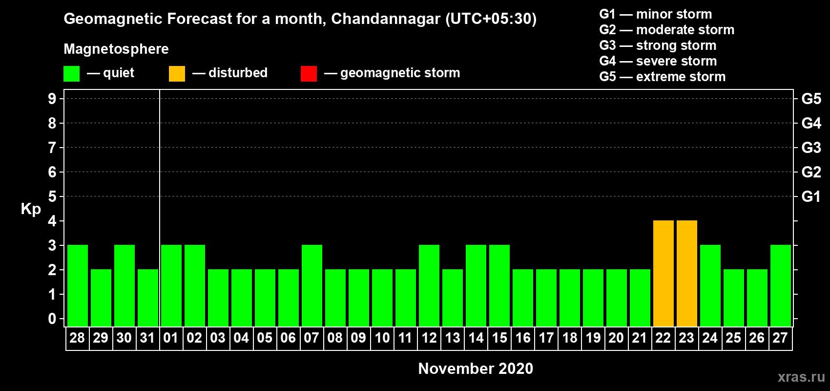 Geomagnetic storm forecast in Chandannagar for Oct 28, 2020