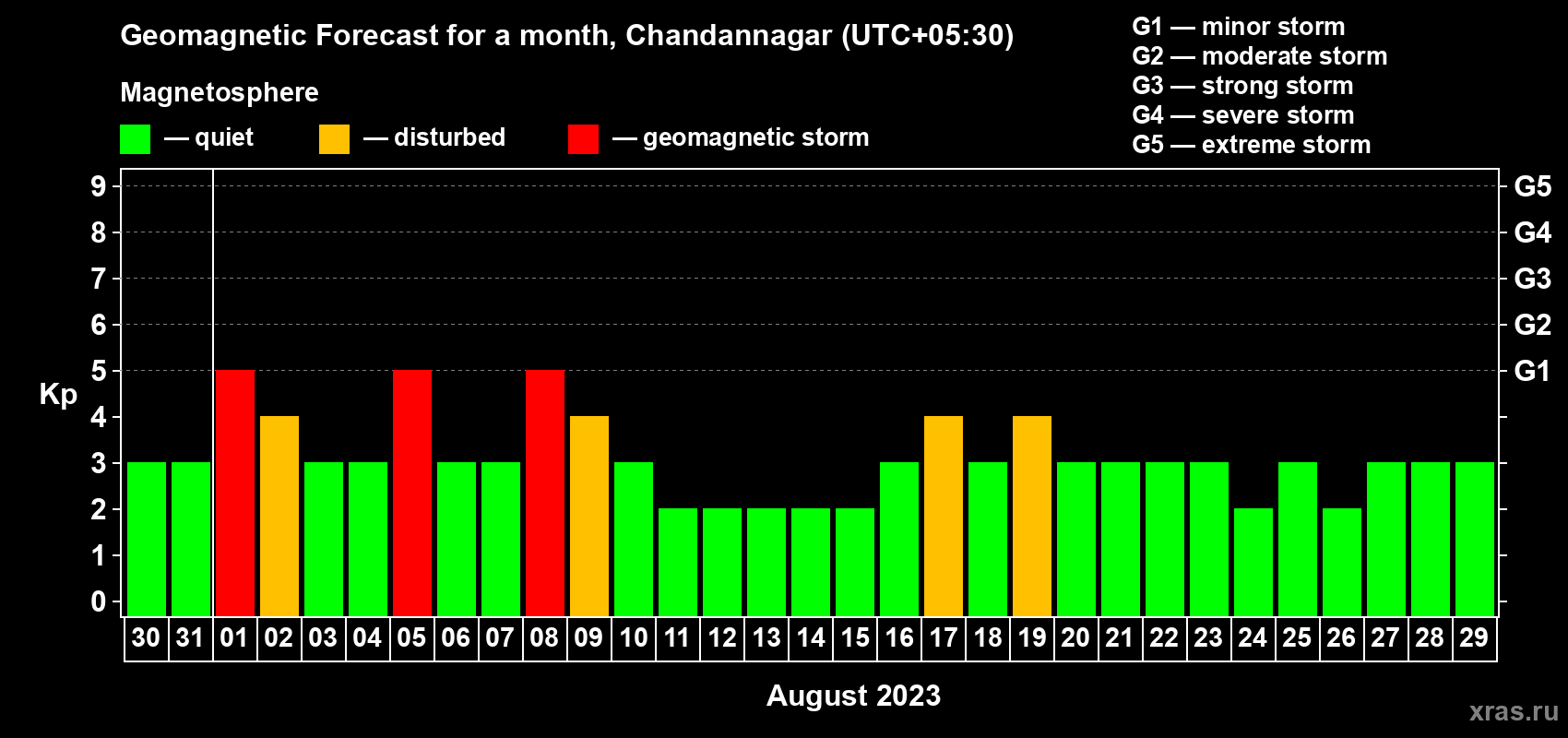 Geomagnetic storm forecast in Chandannagar for Jul 30, 2023