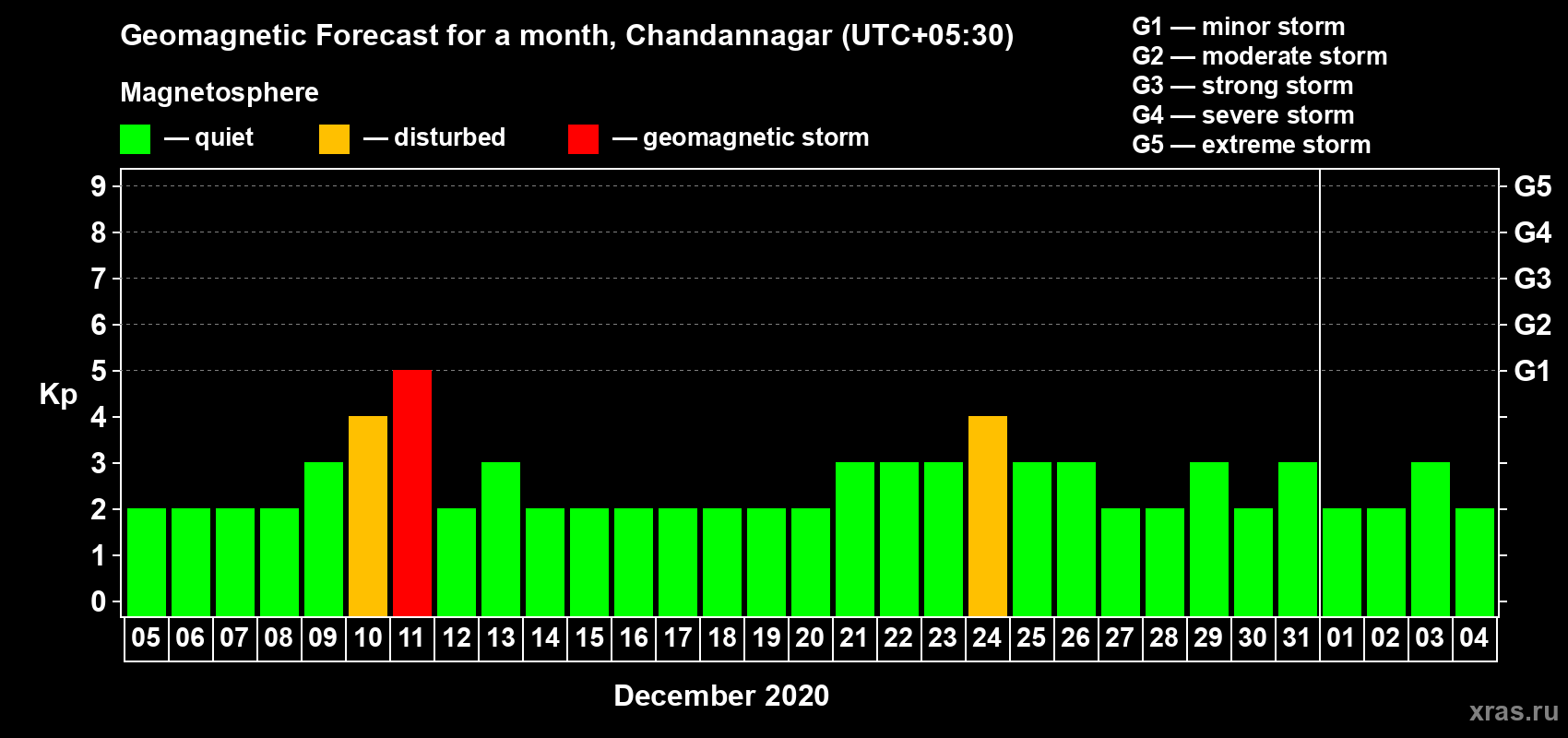 Geomagnetic storm forecast in Chandannagar for Dec 05, 2020