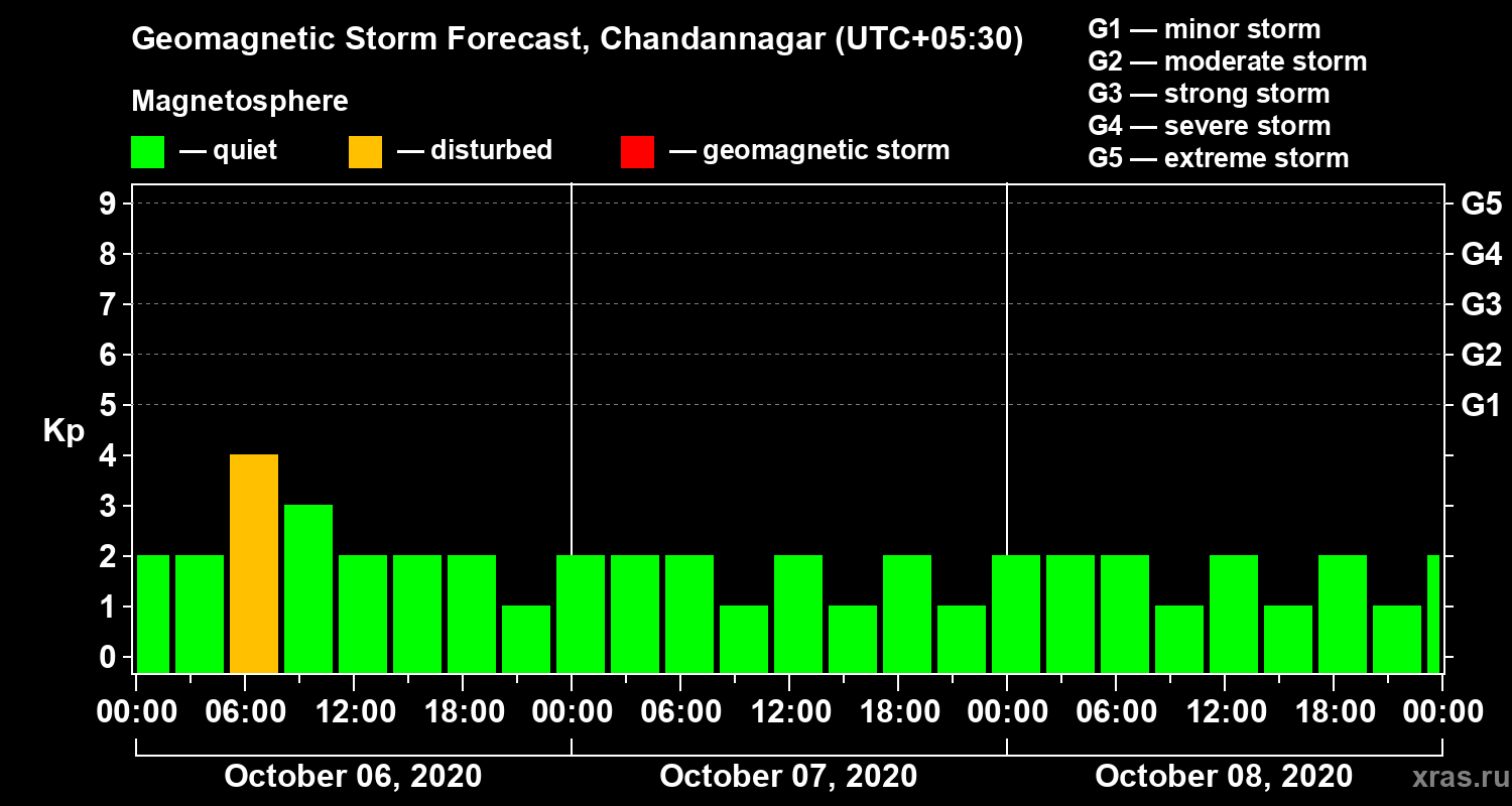 Geomagnetic storm forecast in Chandannagar for Oct 06, 2020