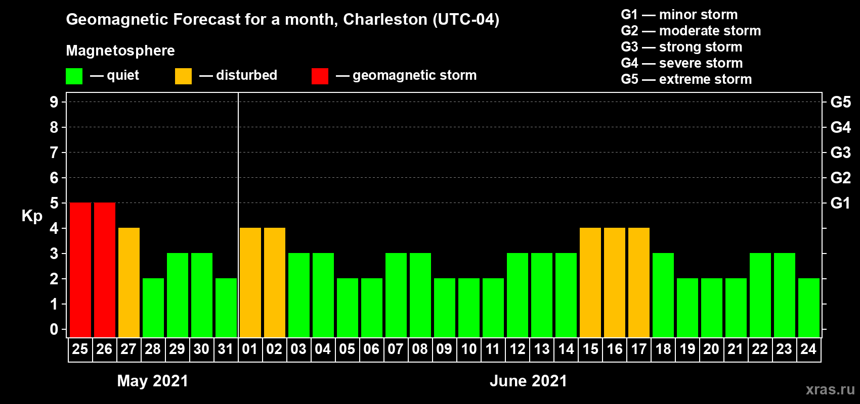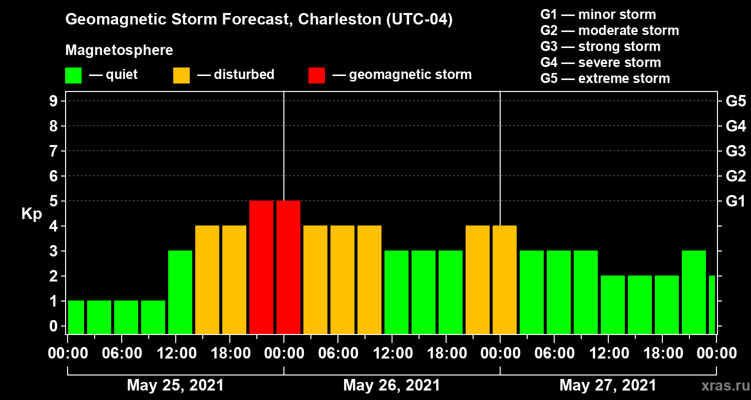 Geomagnetic storm forecast in Charleston for May 25, 2021