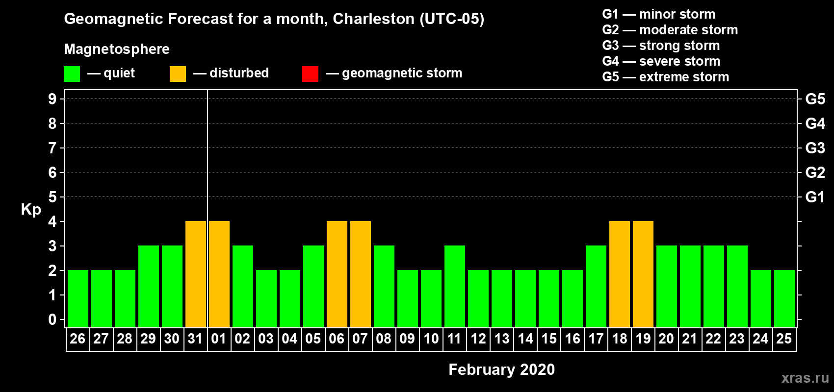 Geomagnetic storm forecast in Charleston for Jan 26, 2020