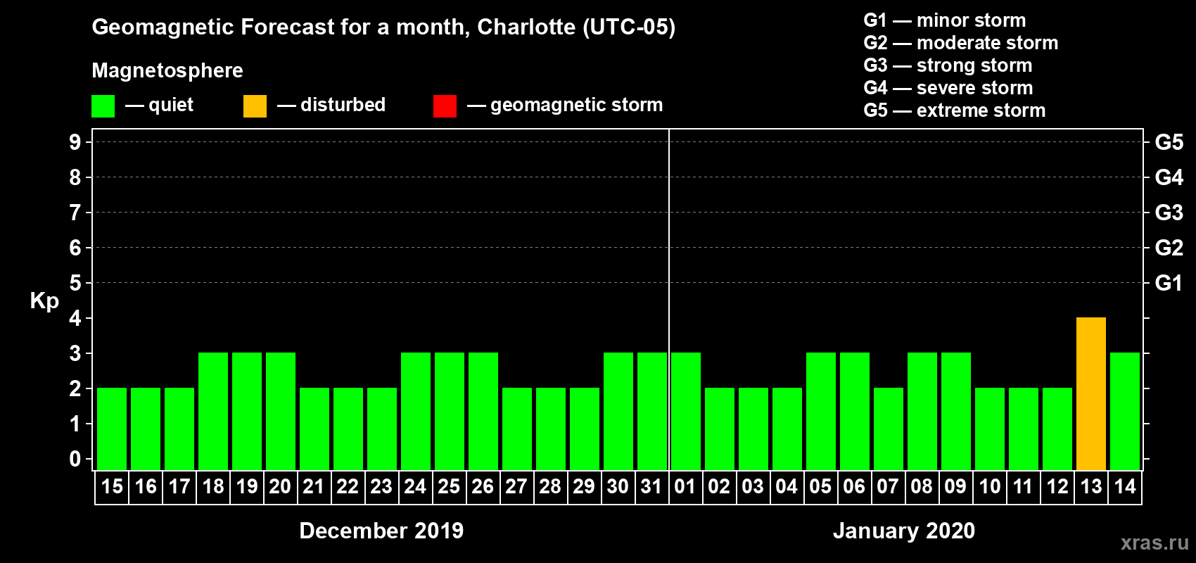 Geomagnetic storm forecast in Charlotte for Dec 15, 2019