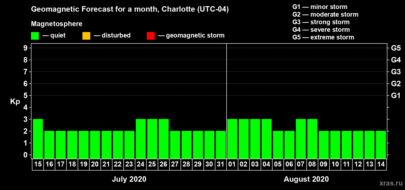 Geomagnetic storm forecast in Charlotte for Jul 15, 2020