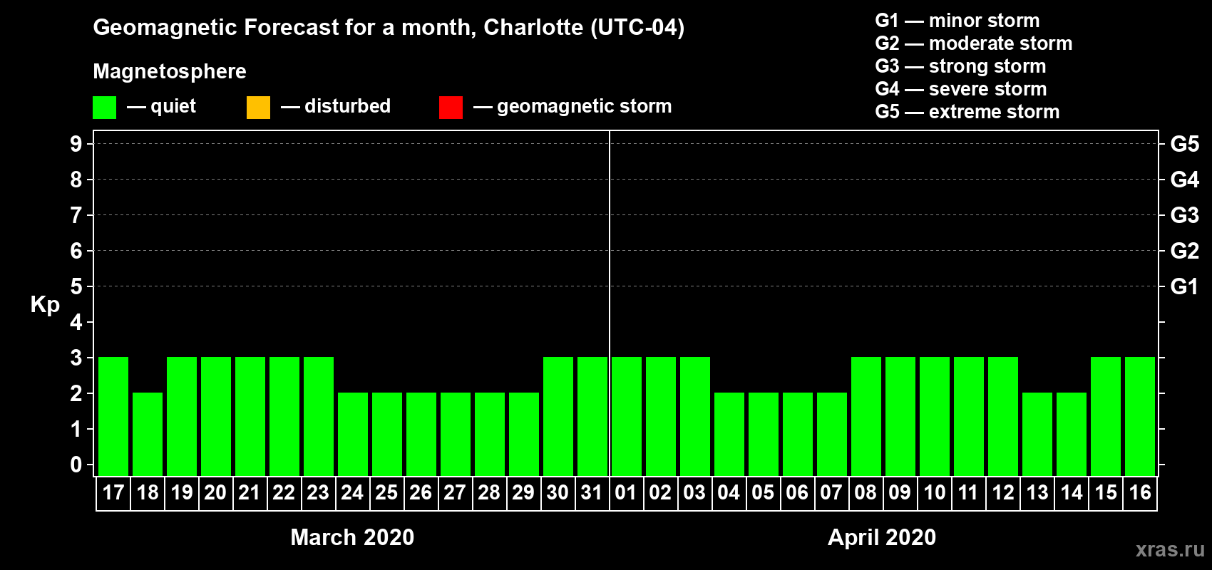 Geomagnetic storm forecast in Charlotte for Mar 17, 2020