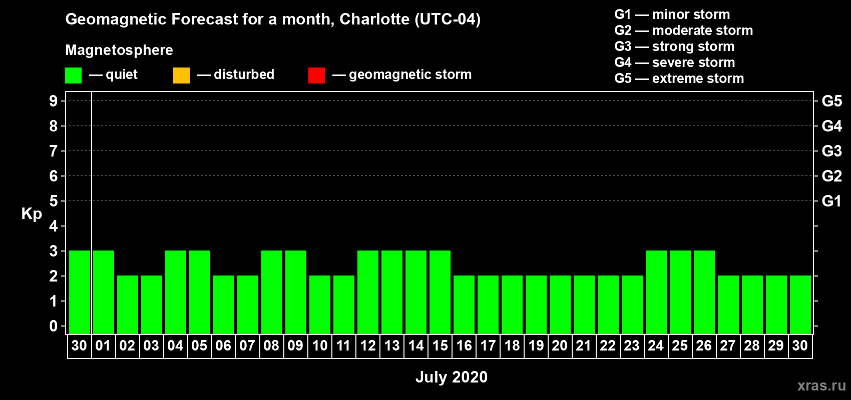 Geomagnetic storm forecast in Charlotte for Jun 30, 2020