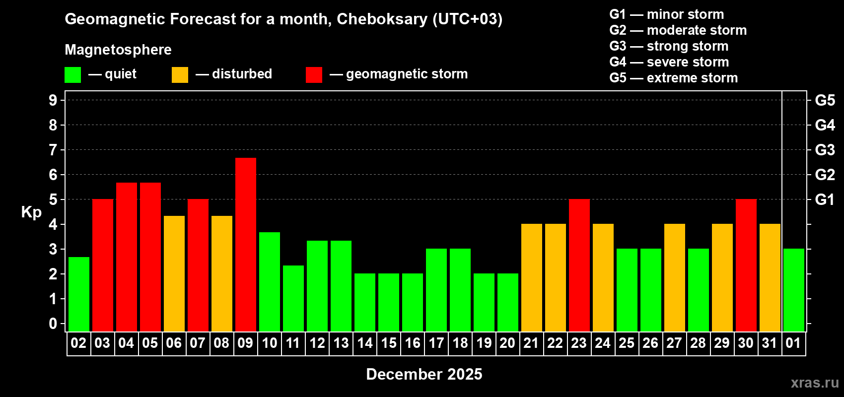 Geomagnetic storm forecast in Cheboksary for Dec 02, 2025