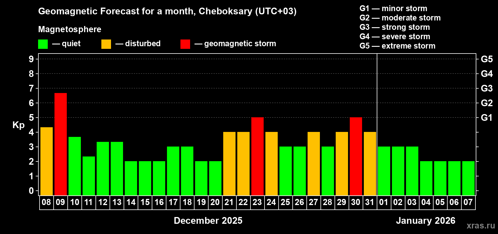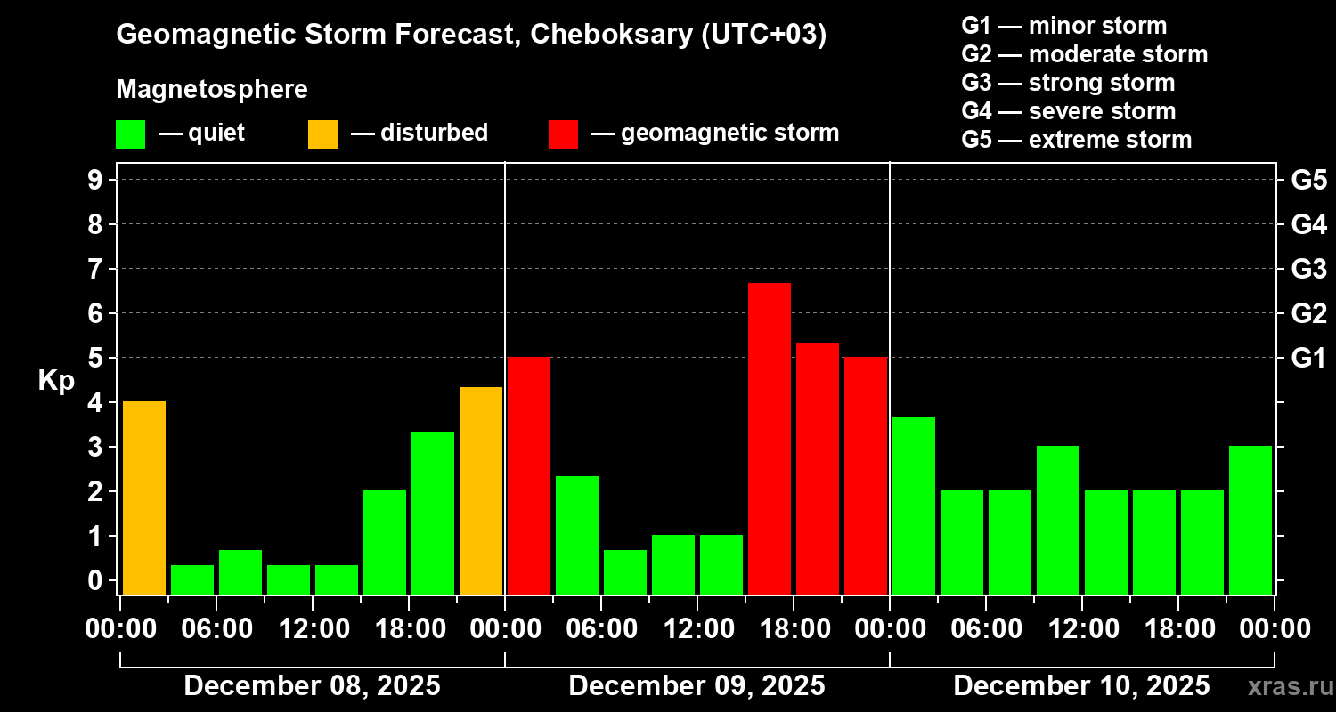 Geomagnetic storm forecast in Cheboksary for Dec 08, 2025