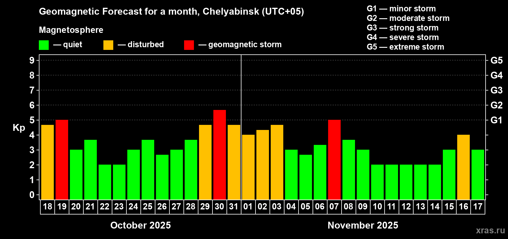 Geomagnetic storm forecast in Chelyabinsk for Oct 18, 2025