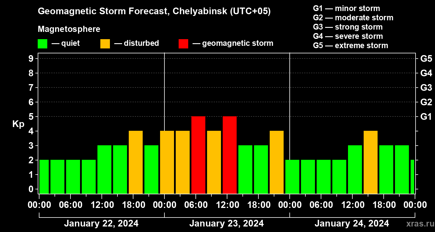 Geomagnetic storm forecast in Chelyabinsk for Jan 22, 2024