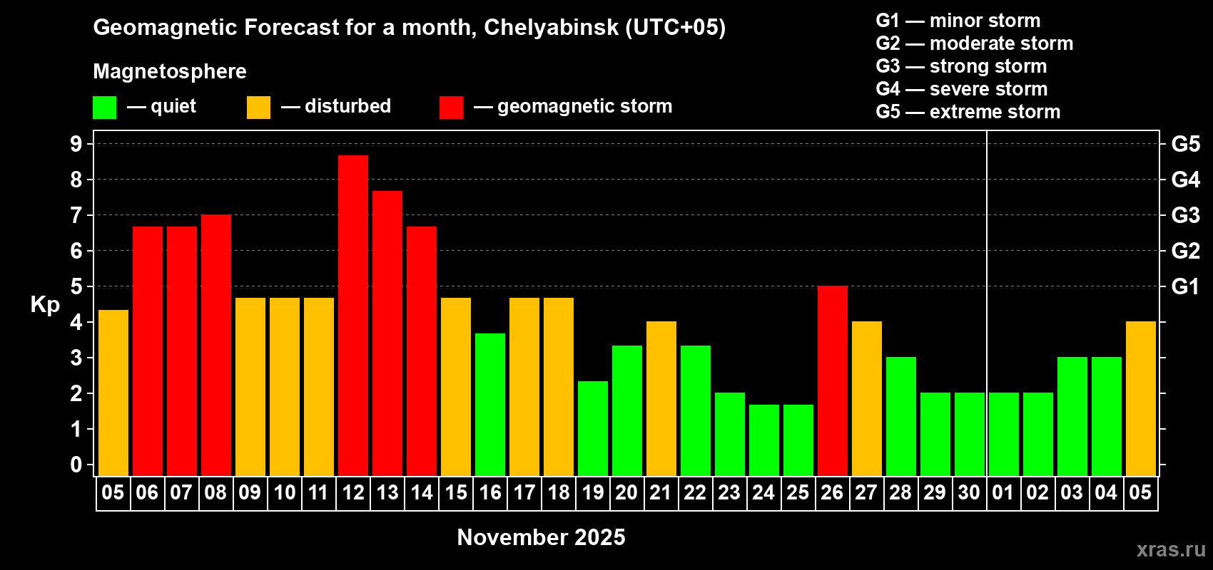 Geomagnetic storm forecast in Chelyabinsk for Nov 05, 2025