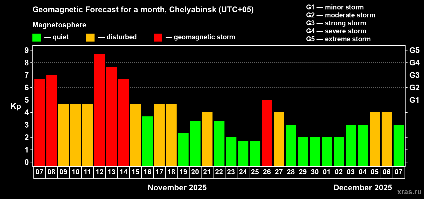 Geomagnetic storm forecast in Chelyabinsk for Nov 07, 2025