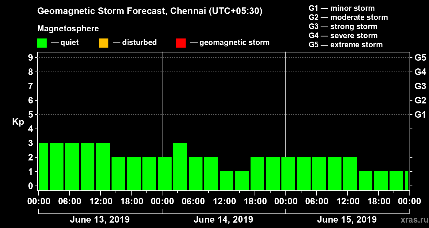 Geomagnetic storm forecast in Chennai for Jun 13, 2019