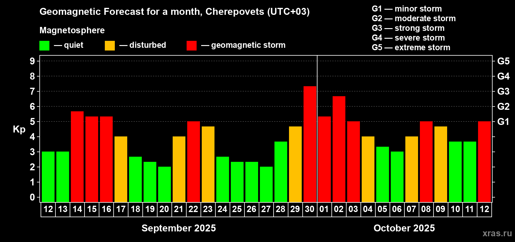 Geomagnetic storm forecast in Cherepovets for Sep 12, 2025