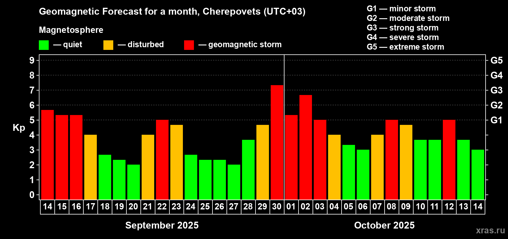 Geomagnetic storm forecast in Cherepovets for Sep 14, 2025