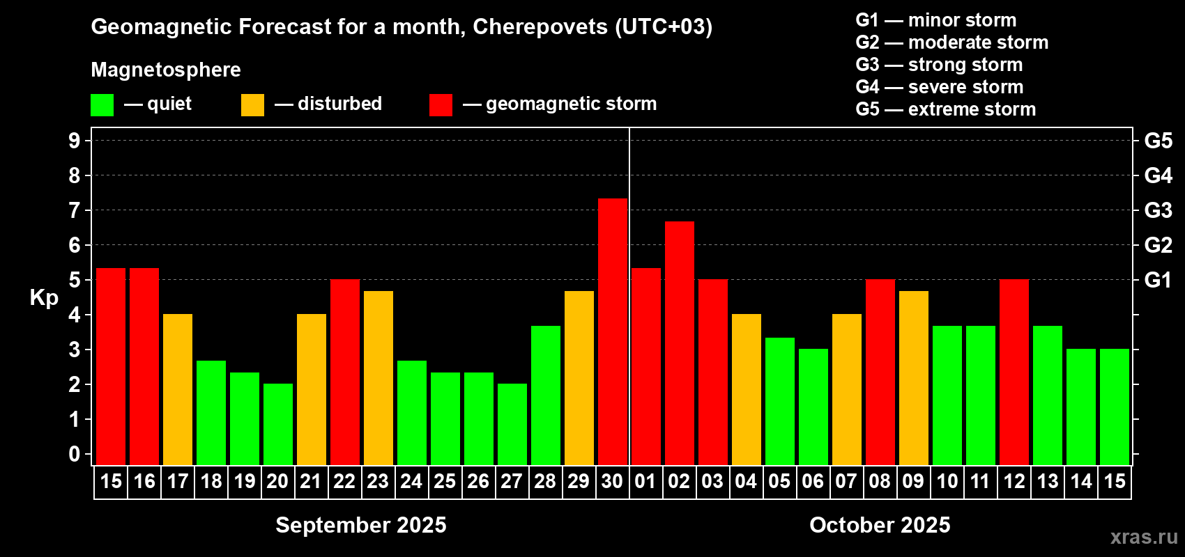 Geomagnetic storm forecast in Cherepovets for Sep 15, 2025