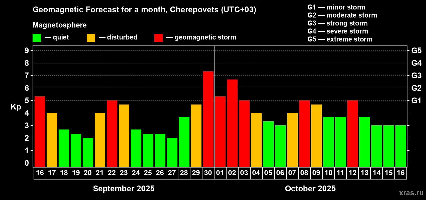 Geomagnetic storm forecast in Cherepovets for Sep 16, 2025