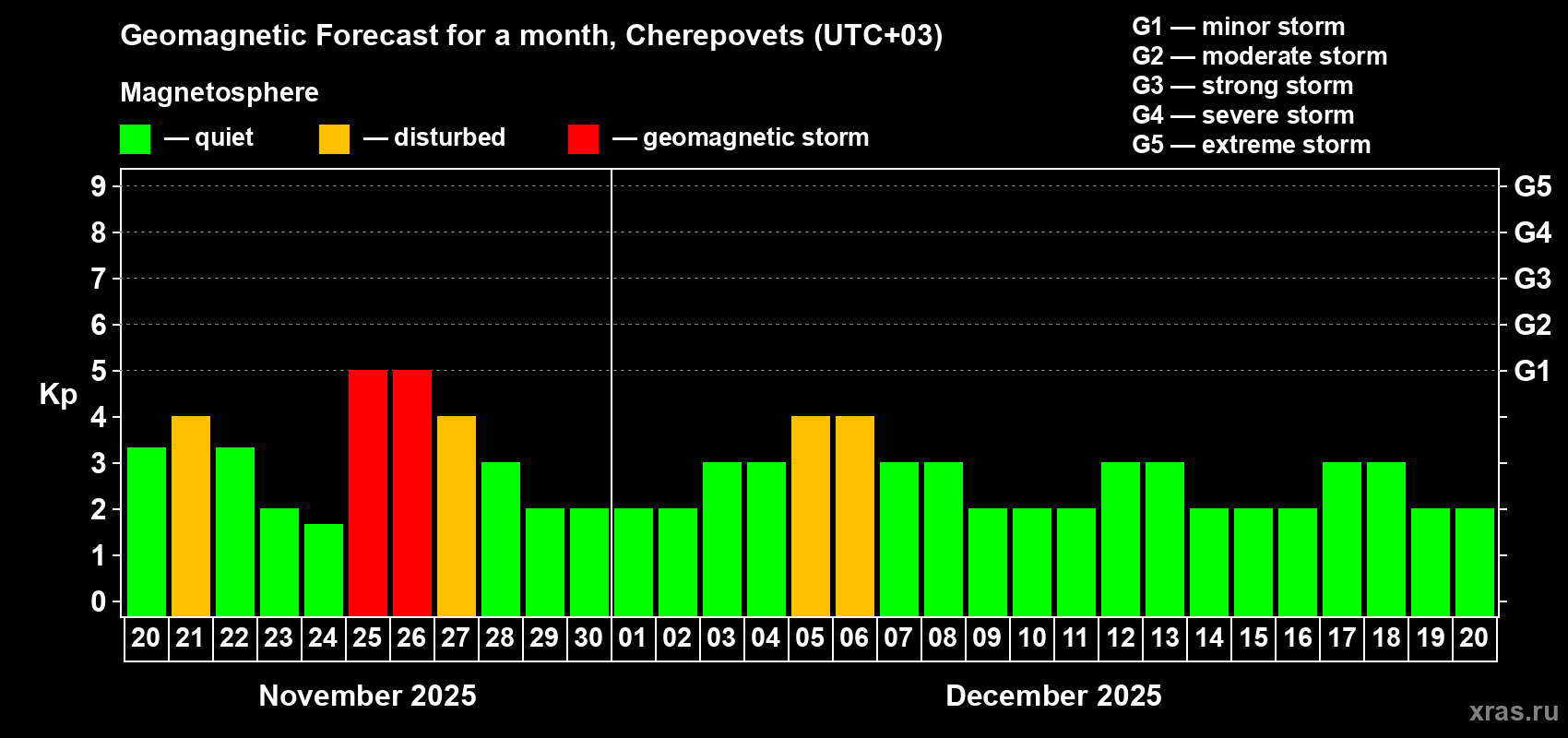 Geomagnetic storm forecast in Cherepovets for Nov 20, 2025