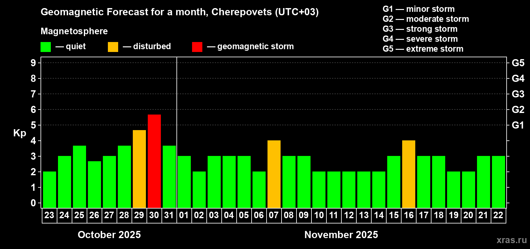 Geomagnetic storm forecast in Cherepovets for Oct 23, 2025