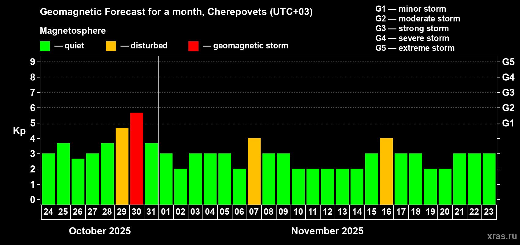 Geomagnetic storm forecast in Cherepovets for Oct 24, 2025